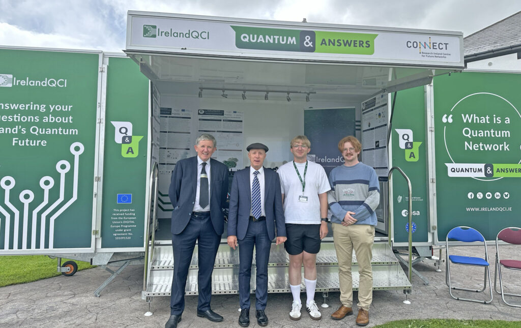 Pictured with the IrelandQCI Quantum & Answers Trailer during The Valencia Lecture in July 2025. From l-r: Pat Kelly, Executive Director CONNECT Centre, Michael Healy-Rae, Minister of State at the Department of Agriculture, Food and the Marine, Dillon Broaders and Jimí O’Baoill de Faoite.